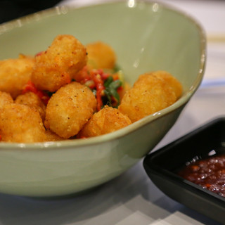 This is the American kick I just mentioned. This dish serves three potstickers with bacon jam on the side. You will need a fork and knife because so much flavor will be bursting out! The crisped cheese on top gives you a nice crunch and with the bacon jam, you're pretty much eating a cheeseburger but in another form. Clever and tasty!